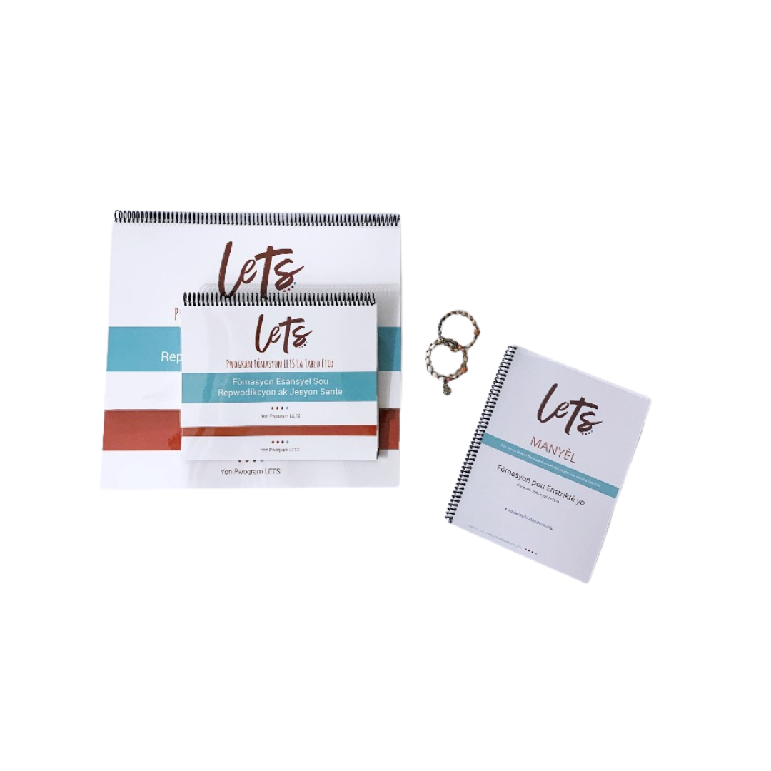 Pake Esansyèl Enstriktè LETS (Kreyòl Ayisyen) bay pwodwi esansyèl pou sipòte fòmasyon elèv yo nan Pwogram Fòmasyon LETS ansanm ak yon manyèl enprime pou fòmasyon enstriktè a. Pake a gen ladan de (2) braslè pou itilizasyon pa ou. Si ou vle itilize epi distribiye braslè yo nan klas ou yo, konsidere achte pake eksklizif oswa pake pare pou klas. Ou kapab achte plis braslè avèk yon rabè 50% lè ou vin sètifye. Si ou bezwen plis pake pèsonalize, tanpri kontakte education@letsempower.org oswa chwazi opsyon pèsonalize selon janw bezwen pwodui yo nan magazen enstriktè a.